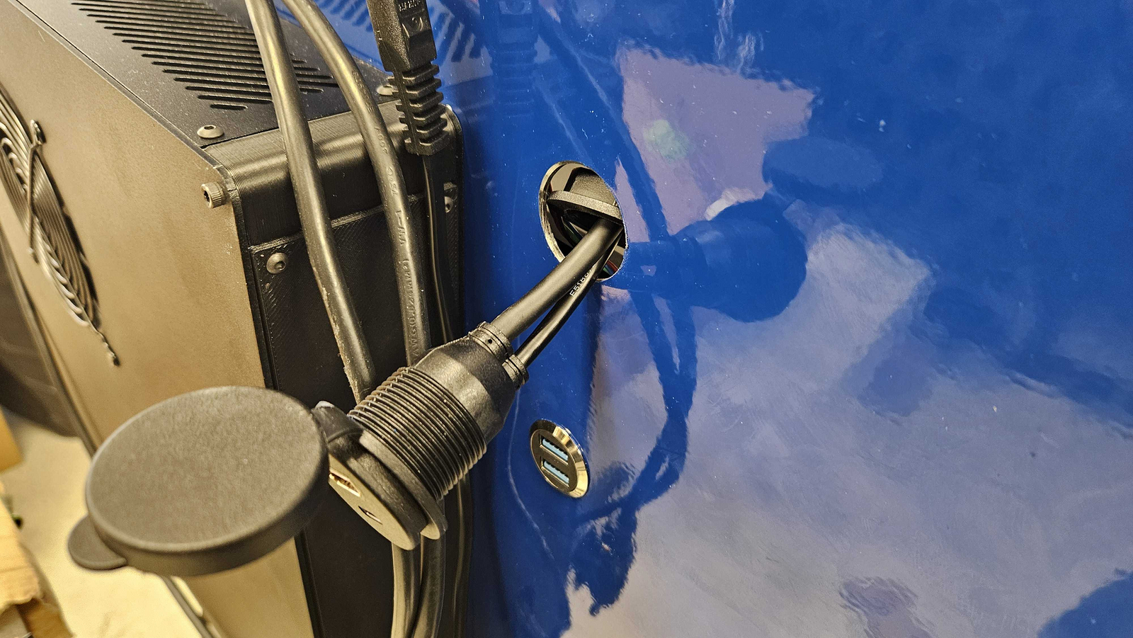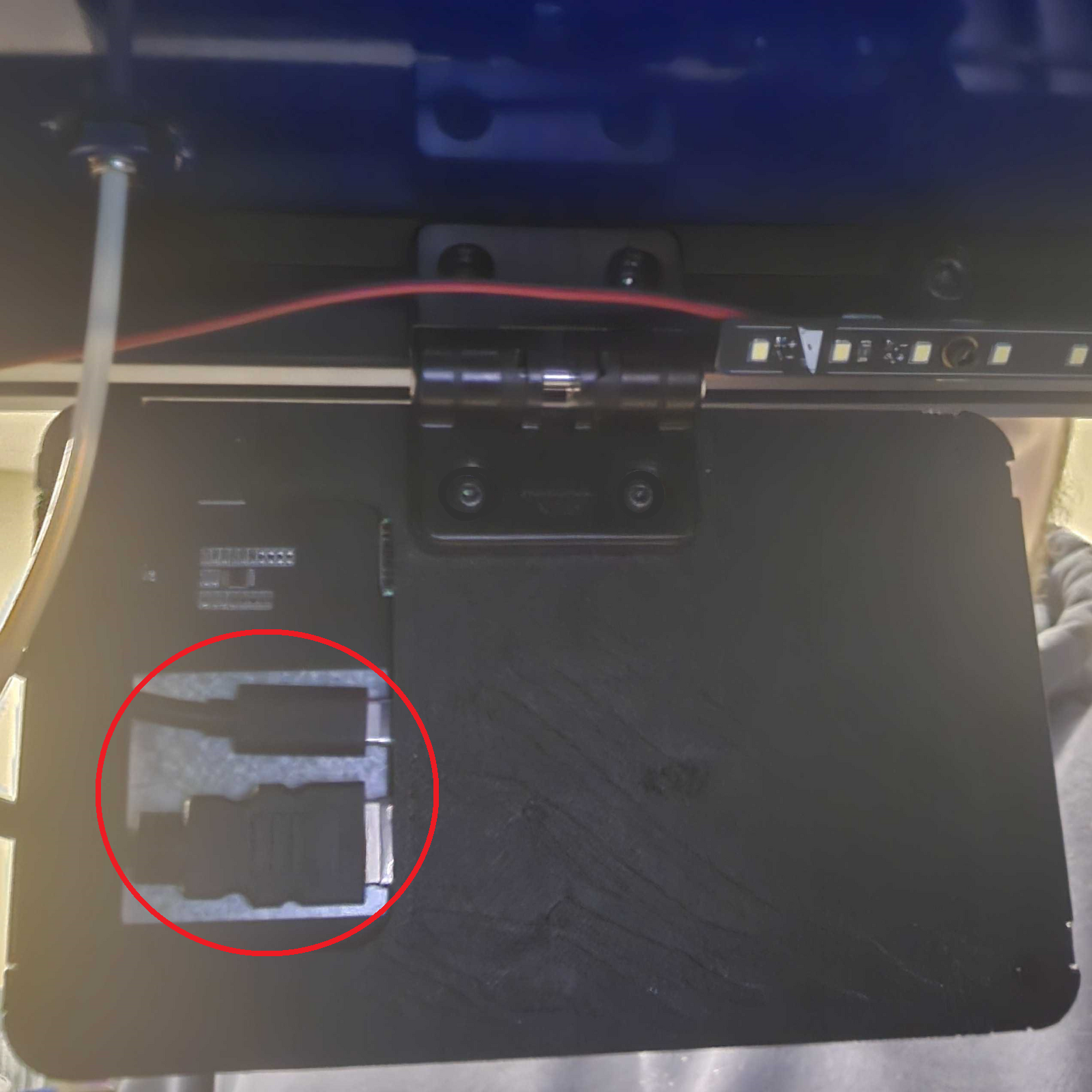 4. On the back wall of the kiosk, rotate the cable adapter the HDMI and USB-C cables are pulling from. The adapter is finger tight, so it should rotate easily.