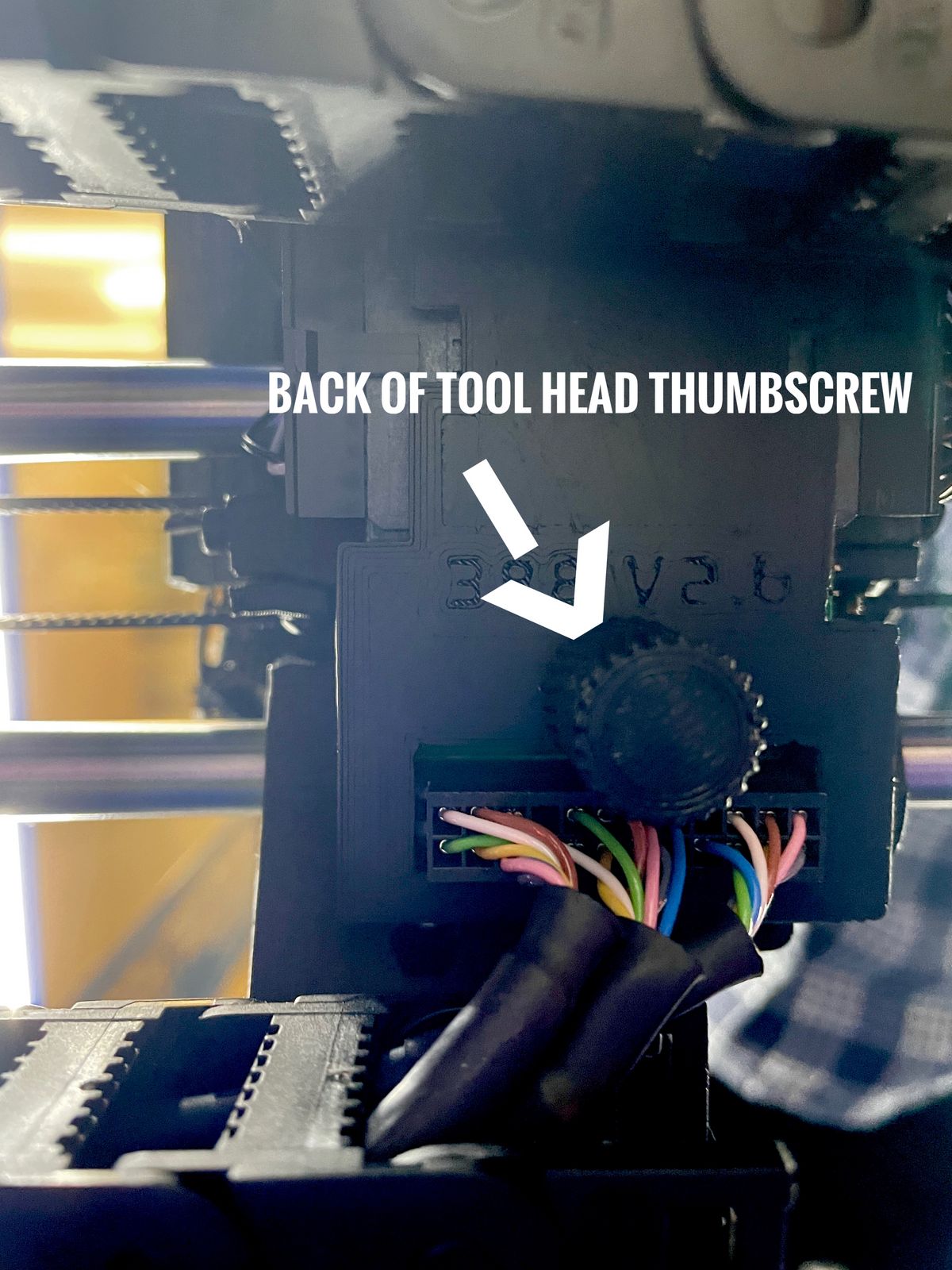 2.2 Hold the tool head in place with one hand. Then, screw in the long back thumb screw FIRST, followed by the top two screws.