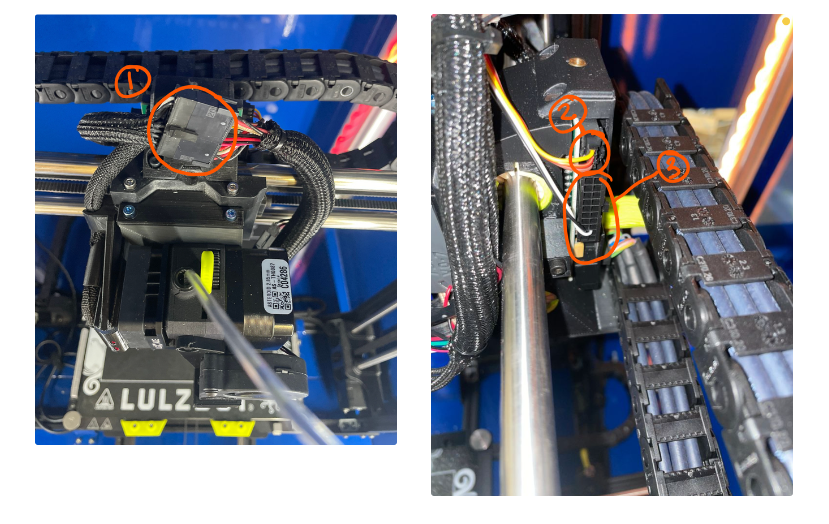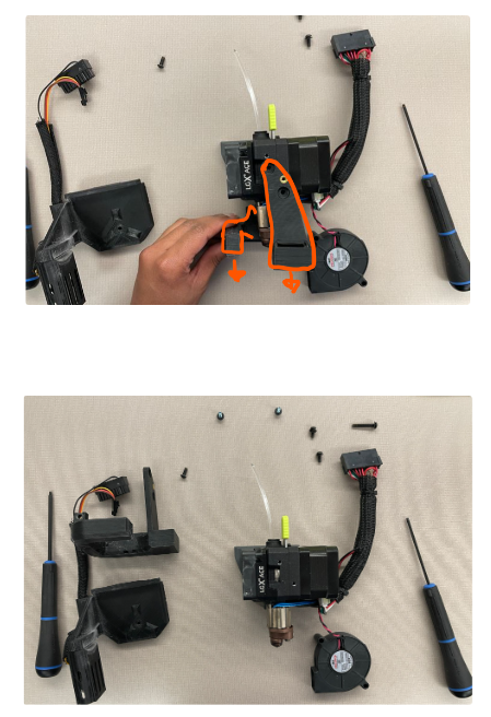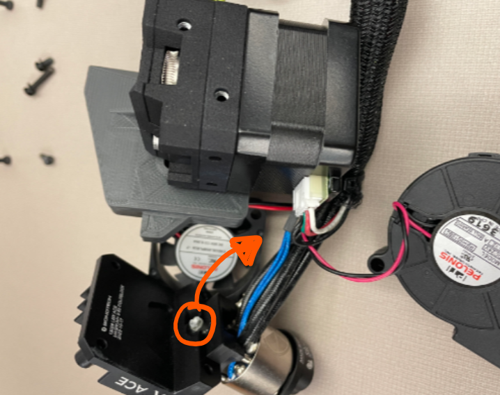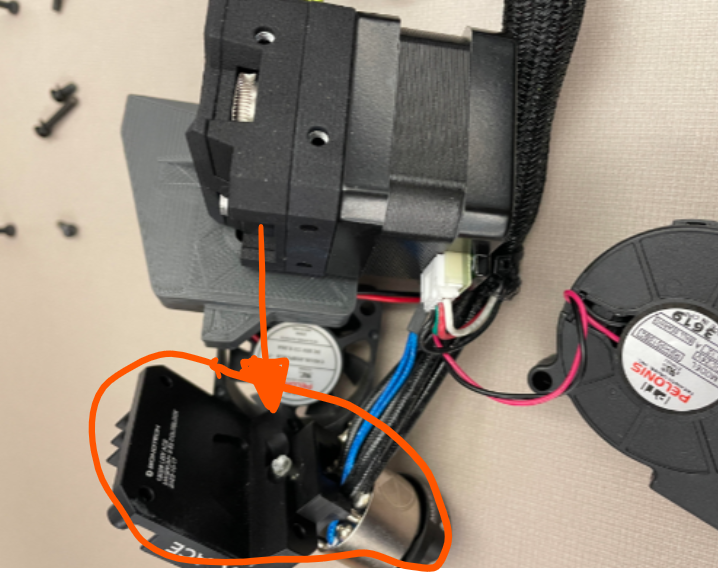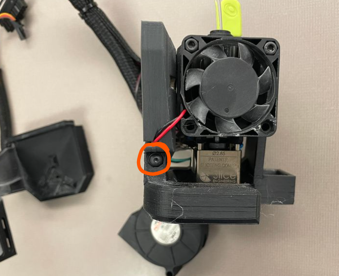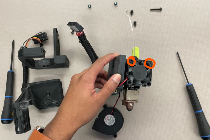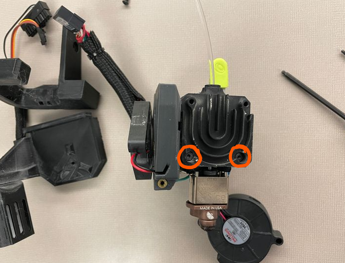 Note: When reassembling the printer, ensure all cables within the orange circle on step 4.3 are still attached to the heat block(the silver piece below the heat sink) when reattaching the heat sink.