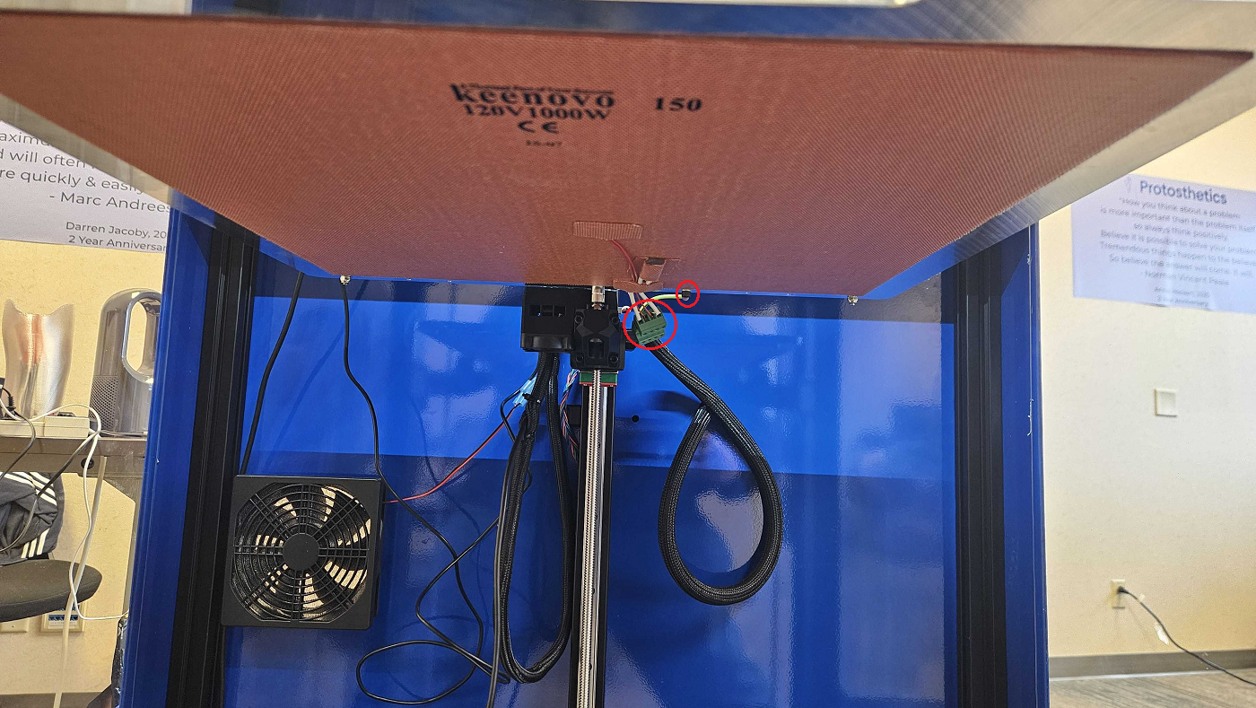 3. On the underneath side of the bed, unplug the green connector cable and the grounding wire. It lightly pulls apart!