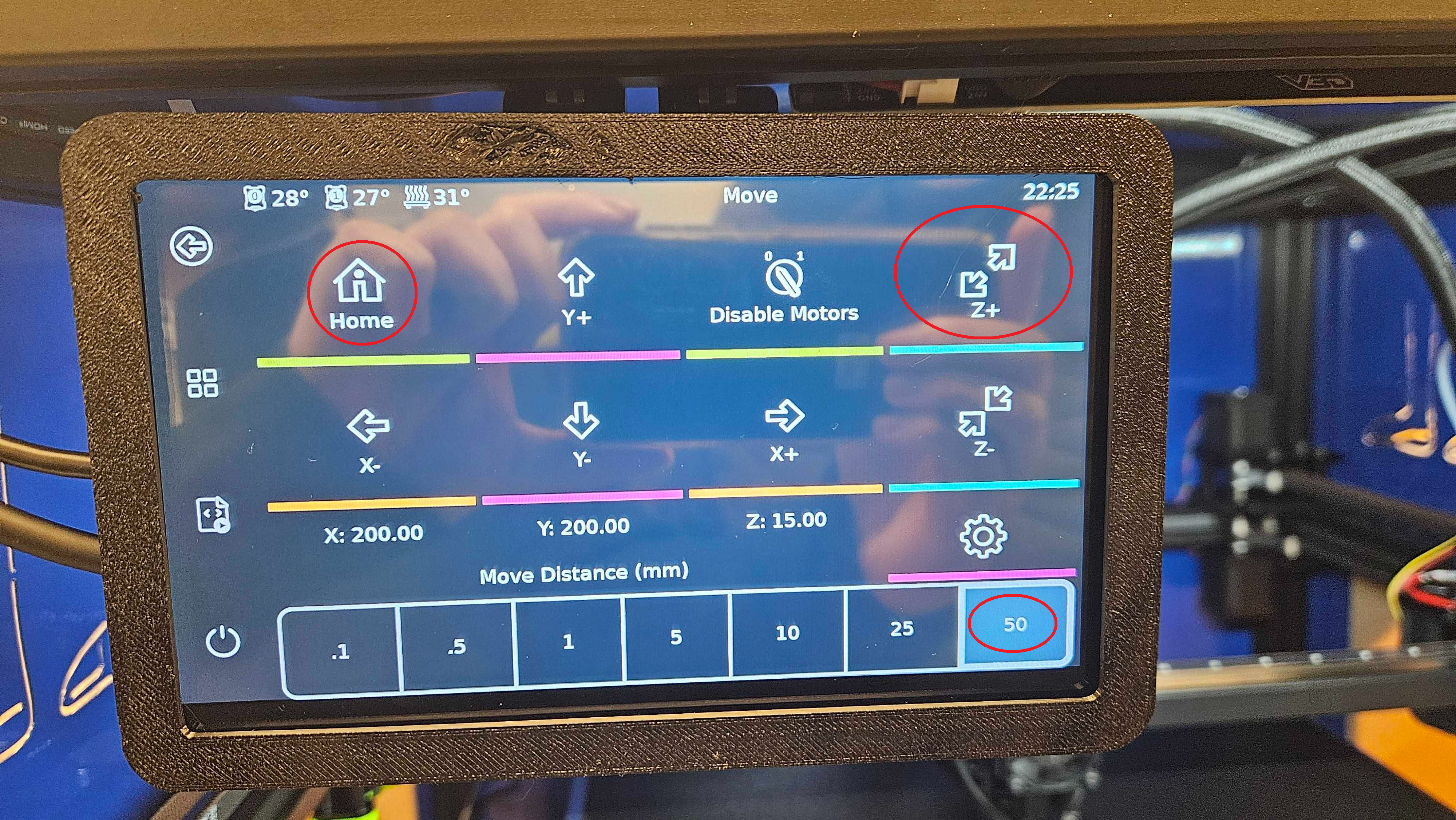 2. On the move screen, select 50 on the bottom right and + on the Z-Axis until the bed is about 4-6 inches from the toolhead. Then unplug the power to the printer.