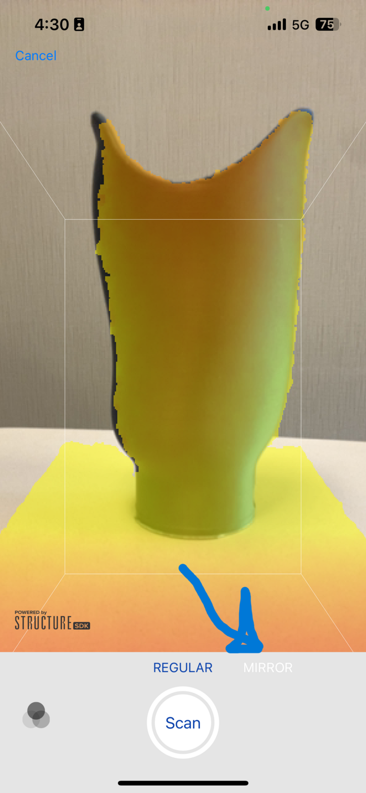 If scanning with a mirror, it's important that you turn on mirror mode in the scanning app so it captures the shape in the correct orientation.