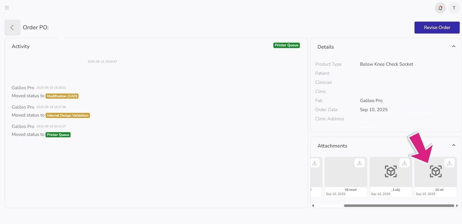 - Once you have opened the desired patient's order, navigate to the attachments and click the 2D STL file. Note, you may need to scroll left and right to see the 2D STL.